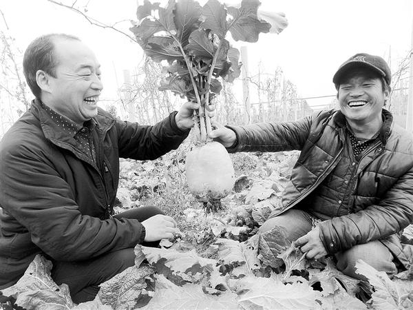 11月23日,商水县供电所驻平店乡大刘庄村第一书记王新奇与贫困群众樊进中看着出土的大萝卜,满脸喜悦。