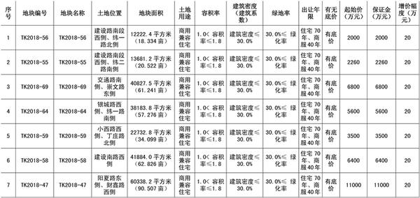 竞买申请人可在2018年11月22日至2018年12月19日登录河南省国土资源网上交易系统(以下简称网上交易系统),提交申请。竞买保证金到账截止时间为:2018年12月19日16时 (地块编号:TK2018-56)。2018年12月19日16时(地块编号:TK2018-55)。2018年12月19日16时(地块编号:TK2018-69)。2018年12月19日16时(地块编号:TK2018-64)。2018年12月19日16时(地块编号:TK2018-59)。2018年12月19日16时(地块编号:TK2018-58)。2018年12月19日16时(地块编号:TK2018-47)。