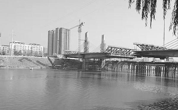 沈丘县沙河大桥项目是沙颍河周口至省界航道升级改造重点工程。大桥全长1.24km,主桥为双塔双索面部分斜拉桥。截至11月26日,该项目已完成投资1.48亿元,占项目总投资的92%,预计2019年1月建成通车。图为建设现场。