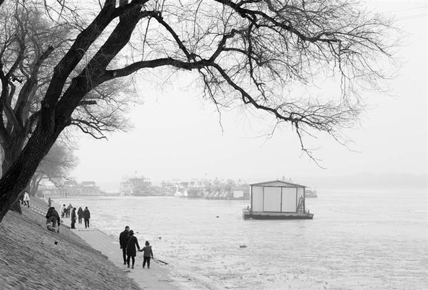 11月26日,市民在开始封冻的松花江哈尔滨段江畔散步。随着天气变冷,松花江哈尔滨段开始封冻。新华社记者 王凯 摄