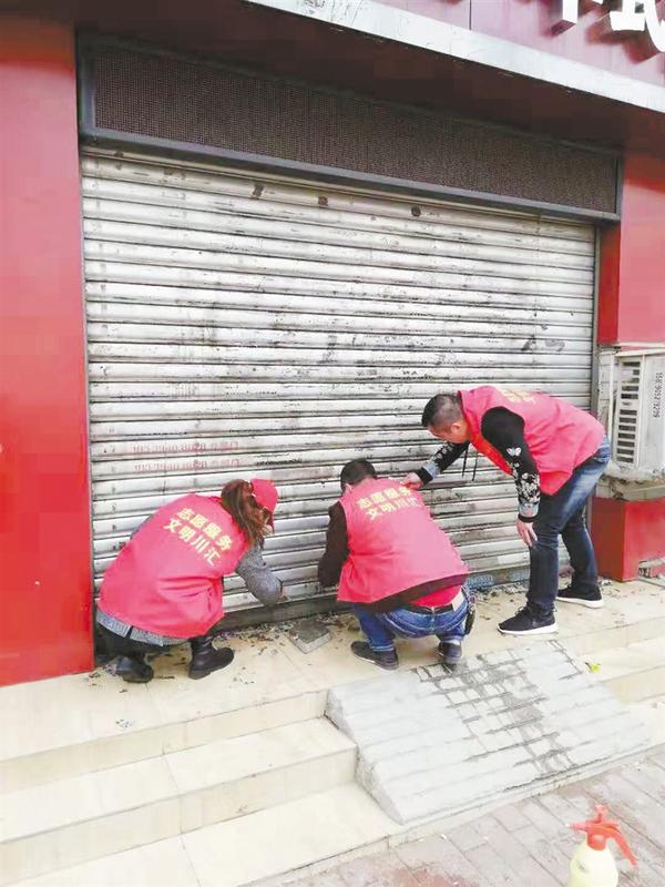 作为城市管理和市容环境整治的“主战场”,川汇区自11月起设立“市容工作日”,进一步深化“五城联创”工作,切实改善中心城区面貌。11月27日,“市容工作日”活动正式启动,川汇区各单位纷纷组织志愿者走上街头,在各自辖区开展小广告清理等环境综合整治工作。图一为志愿者粉刷布满小广告的建筑物外墙。图二为志愿者清理地面上的小广告。图三为志愿者清理卷闸门上的小广告。