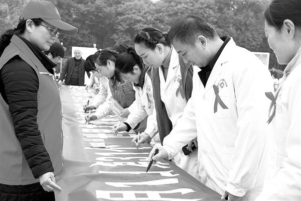 活动现场,医护人员向群众发放宣传资料1800余册(种),接受230多人次的咨询服务。图为参加活动的群众和医护人员在预防艾滋病百米长卷上签名。