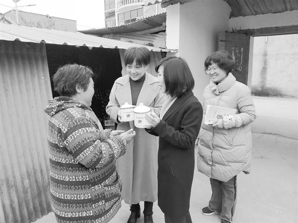近日,共青团周口市委牵手周口妇产医院组成帮扶队,到西华县东王营乡李方口村开展爱心茶缸捐赠活动。图为帮扶队员向贫困户发放爱心茶缸。