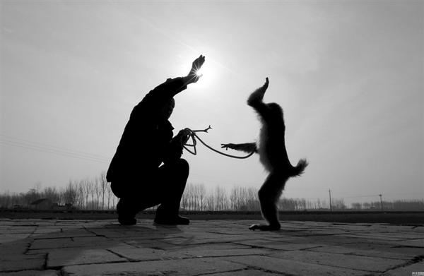 猴子,与人类有着相近的形象、聪明和机灵,尤其经过专门训练以后,能模仿人类做出多种动作,因此,倍受人们喜爱。耍猴,又叫玩猴,在我国有悠久历史,唐代的古籍上,对养猴、驯猴、耍猴就有详细介绍。耍猴,是民间的一项娱乐活动,也是一项民间艺术,或者说是一项街头艺术。农闲时节,耍猴人带着自己饲养繁殖的猴子,外出耍猴卖艺。他们露宿街头巷尾,啃凉馍、喝冷水,辛辛苦苦赚几个小钱。当遇到恶劣天气或特殊情况,只好以乞讨为生。到了农忙季节,该收庄稼了,他们又不顾路途的遥远坎坷,带着猴子匆匆赶回家乡……说起耍猴人的辛勤、辛苦、辛酸,不禁令人心头沉重。著名诗人王继兴曾写一首《浣溪沙·耍猴人》,也许记述的就是他们:“铜锣一面作道具,瘦猴三只是伙计,闯南荡北总相依。四季无奈走江湖,三餐有赖卖猴趣,毅然笑迎风和雨。”