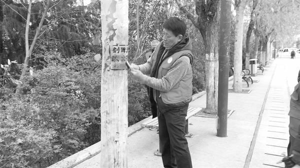 虽然上次巡访发现的部分问题没有解决,但巡访团志愿者仍对滨河路环境、秩序的进一步提升充满信心。在回访过程中,志愿者冒着刺骨的寒风,手持工具认真清理乱贴乱画的小广告(如图三)。为提升工作效率,巡访团志愿者还兵分两路沿着滨河路两侧开展清理小广告、捡拾垃圾、劝导不文明行为等活动。①9