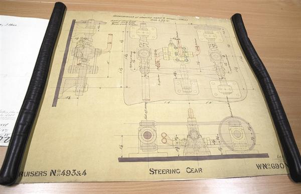 新华社记者日前在泰恩—威尔档案馆查找北洋海军史料时发现一套名为“中国巡洋舰舵机设计图”的原始图纸。这套图纸共7张,上面用红、蓝、黑三色手绘标注舰船舵机系统,数据具体到诸如舵柱直径,对舰型、舱室布局等也细致描绘。舵机是改变舰船航向的操作系统,作用类似“鱼尾”。