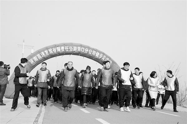 12月14日,河南高速发展有限责任公司周口分公司的160多名员工相聚沙颍河畔,开展健步走活动。作为河南高速周口段的管理者和服务者,他们长期奔波在高速服务一线,为周口经济发展提供交通和服务保障。此次活动,凝聚了公司员工的向心力,展示了他们的良好精神风貌。记者 梁照曾 摄