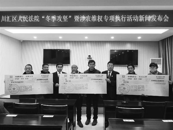 12月26日下午,川汇区人民法院召开“冬季攻坚”暨涉农维权专项执行活动新闻发布会。今年以来,川汇区法院执行局共受理拖欠农民工工资等涉农维权案件233起,涉及农民工271人,执结210起,涉案标的630余万元,为农民工追回工资572万元。图为法官为3位农民工代表发放执行款21.5万元。记者 窦娜 通讯员 唐玉吉 摄