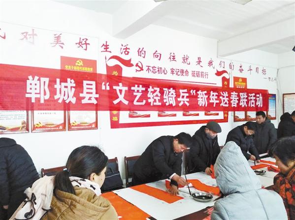 2019年元旦前夕,郸城县委宣传部、县委统战部、县书法家协会联合举办“红色文艺轻骑兵”书法家“送万福进万家”活动,在县委统战部定点帮扶的虎岗乡后赵行政村,为贫困户送去了丰富的文化大餐。(记者 徐松 通讯员 王忠朴 摄)