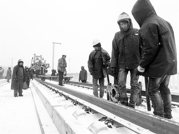 1月9日,漫天飞雪,寒气逼人,郑阜高铁西华段建设现场却热火朝天。为确保工程建设如期推进,中铁一局的工人们冒雪以每天至少5公里的速度进行铺轨作业。据了解,郑阜高铁西华段全长33公里,铺轨工作预计5日内完工。 记者 张猛 摄