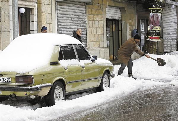1月9日,在黎巴嫩首都贝鲁特以东的山区,人们清扫积雪。黎巴嫩自6日起遭遇极端暴风雨雪天气。统计数据显示,黎巴嫩全国各地已报告581起医疗急救事故和703次疏散和转移行动。新华社发
