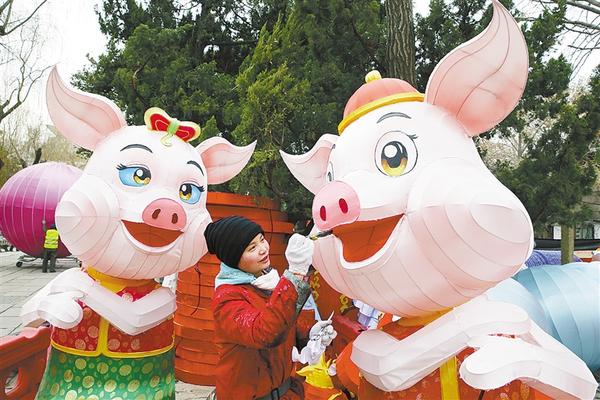① 1月9日,一名花灯艺人在山东济南市趵突泉公园为猪年生肖花灯做最后修饰。