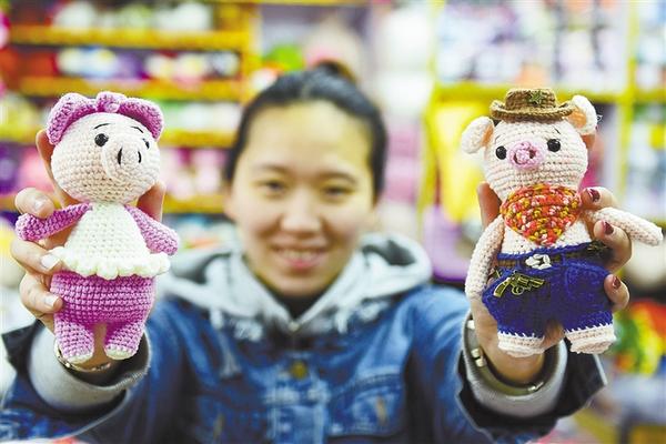② 1月9日,江苏无锡创业青年章雯艳在展示自己用毛线编织的卡通猪玩偶。