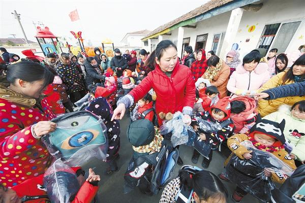1月15日,在周口市委宣传部驻扶沟县汴岗镇强陵岗村工作队员的协调下,周口凯盛实业有限公司特意为该村幼儿园的孩子们送来了价值4万元的羽绒服和书包等礼品。图为幼儿园的孩子们正在领取礼品。记者 刘俊涛 摄