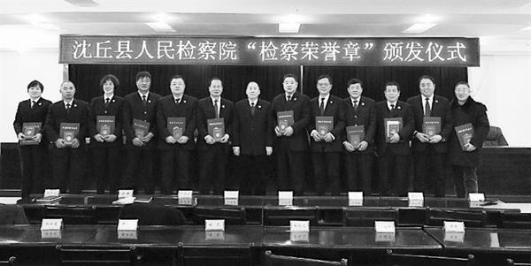 本报讯(记者 姬慧洋 通讯员 徐建 文/图)1月14日,沈丘县人民检察院举行从检30年检察荣誉勋章颁发仪式,向从检满30年的25位老领导、老同志和在职干警致敬,感谢他们为沈丘检察事业作出的突出贡献,进一步增强全体检察人员追求卓越、争创一流的信心。