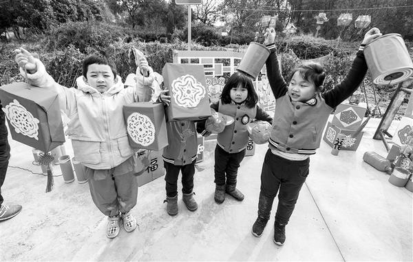 1月16日,孩子们展示用废旧物品制作的环保节日花灯。 临近春节,浙江省长兴县开发区中心幼儿园的老师和孩子们来到长兴县太湖街道下属的新塘村,为村民表演文艺节目,用喜庆的传统舞蹈营造节日气氛。