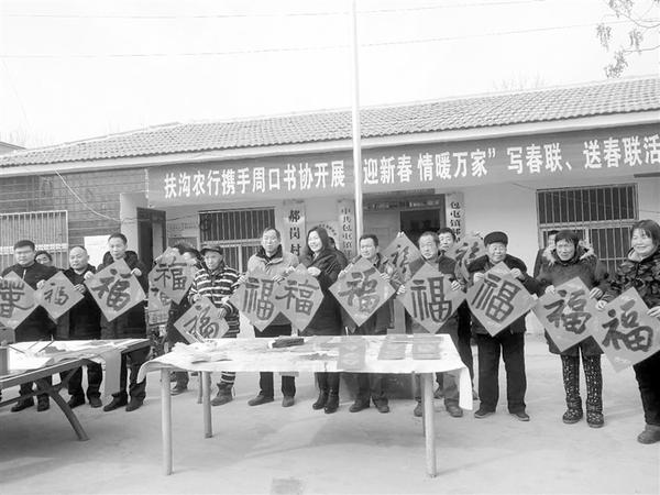 1月18日上午,扶沟县包屯镇郝岗村委大院里笑声不断,暖意融融,农行周口扶沟支行携手市书协正在这里开展“迎新春情暖万家”写春联、送春联活动。市书协会员现场为村民们义写春联,把党委和政府的关怀与温暖及美好祝愿送到老百姓的心坎上。②8