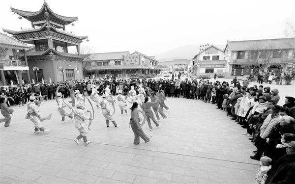 多彩表演迎新春 1月20日,在甘肃平凉市崆峒古镇,游客观看新春民俗活动中的安塞腰鼓表演。新华社发