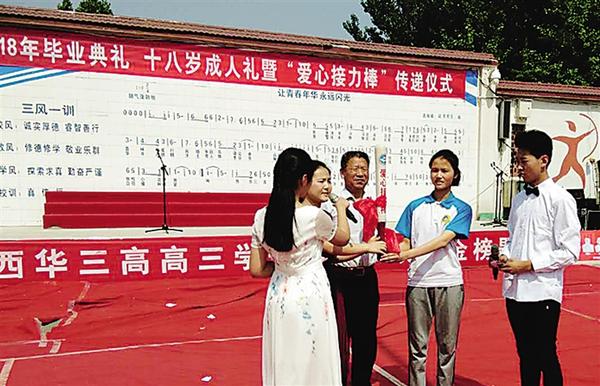 每年的6月4日下午,是三高师生最最激动、最最兴高采烈的时刻。届时,全校师生早早来到操场迎接县教体局和兄弟学校的观摩领导、爱心人士、应邀家长,参加西华三高一年一度的毕业典礼、”爱心接力棒”传递和十八岁成人礼。仪式分“感恩母校”“感恩老师”“感恩家长”“爱心传递”“迈过成人门”、向国旗宣誓、学弟学妹助考加油等。当高三师生在主席台紧紧拥抱时,当父母与孩子在主席台交换书信时,当“爱心接力棒”从高三学哥学姐传递到高二、高一学弟学妹手中时,台上台下、会场内外、老人孩子,全都听任激动的泪水在脸上欢快地奔流,全都沉浸在爱的温暖中。可以说,“爱心传递”早已成了西华三高师生包括家长沟通的桥梁和纽带,“爱心接力棒”则是学校独创的教具教材。