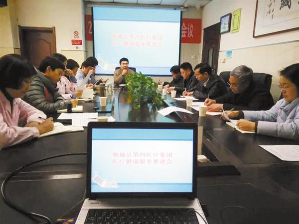 本报讯(记者 徐松 通讯员 李玉梅 文/图)1月12日,郸城县第四医疗健康服务集团在郸城县妇幼保健院小会议室召开医共体建设工作推进会。县妇幼保健院领导班子和辖区医共体成员单位负责人参加会议。会议由郸城县妇幼保健院副院长杨军主持。