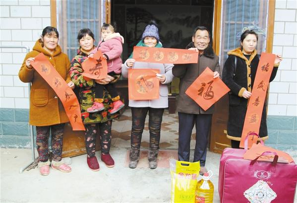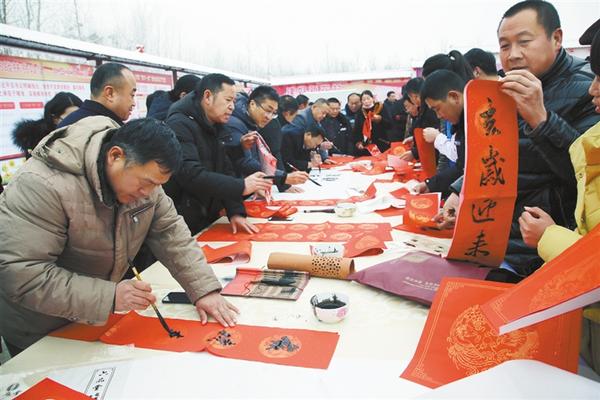 鹿邑县通过持续开展文化、科技、卫生“三下乡”系列活动,把温暖送到农村,把欢乐送进基层,把健康送给农民,把技术送到地头……让农民群众广受益、多受益,让党的好政策在农村落地生根。图①为群众展示春联。图②为书法爱好者义写春联。