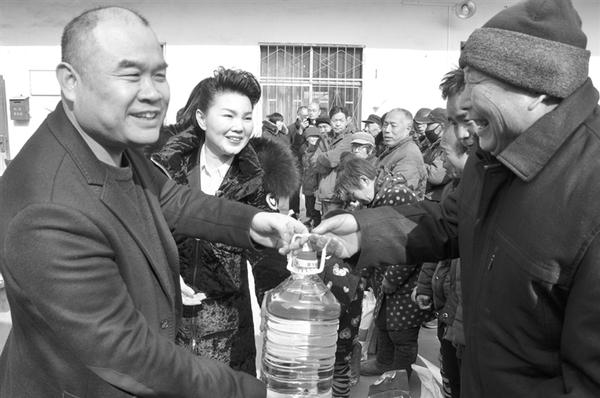 1月26日上午,在商水县魏集镇“扶贫济困 爱心捐赠”现场,省越调剧团、商水建业负责人把价值8万多元的米、面、油等物品发放到群众手中。享受国务院特殊津贴的省越调剧团团长申小梅还为村民表演了耳熟能详的《收姜维》选段。②5记者 付永奇 摄