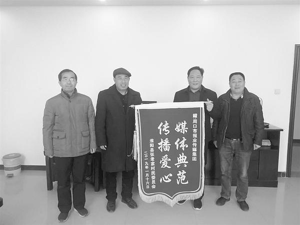 本报讯(记者 黄佳 文/图)“传播爱心,媒体典范”“为民解忧愁,心系千万家”。1月25日上午,淮阳县刘振屯乡张老家行政村村支书张纪全专程赶到周口,给周口报业传媒集团、周口市啄木鸟志愿者服务工作委员会送来两面锦旗,表达他们的感激之情(如图)。