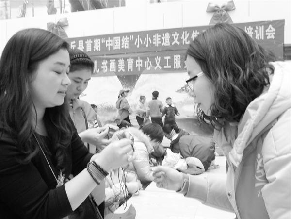 为了培养青少年的创新精神和动手能力,扩大非遗传承队伍,更好地传承非遗文化,日前,沈丘县义工联合会在该县全家福城市广场,组织青少年开展主题为欢喜“‘中国结’,编织中国梦,平安过大年”暨非遗文化中国结编织技艺公益培训活动。活动期间,吸引了该县300余名青少年报名参加培训学习。图为沈丘县中国结非遗传承人——李海花(左一)正在向青少年传授中国结编织技艺。谢辛凌 摄