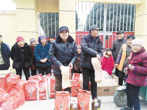本报讯 (记者 杨光林 通讯员 王新扩 文/图) 1月28日,农历小年。当天,项城市贾岭镇苏阁行政村贫困群众和80岁以上老人纷纷来到村小学门前,领取乡贤联谊会为他们置办的年货(如图)。