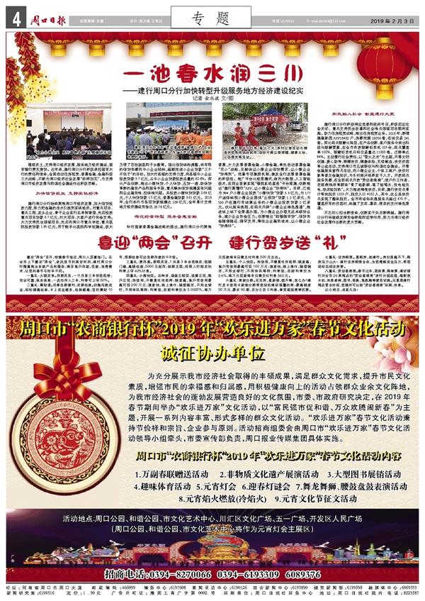 建行周口分行积极响应党委和政府号召,积极回应社会关切,重点支持民生改善和社会难点领域项目顺利实施。助力住房租赁战略,推出住房租赁业务。2018年,新增建融家园APP18482户,房源挖掘16056套,在线交易241套。深化网点智慧化转型,在产品创新、客户服务中突出科技与智慧要素,在全市布放智慧柜员机103台,网点覆盖率100%,智慧柜员机日均交易量达11000笔,迁移率达94%。主动履行社会责任,以“萤火之光”为主题,开展文明创建、爱心助考、捐赠扶贫、健康体检、无偿献血、扶贫济困等公益活动,支持周口市五城联创与和谐社会建设。开展金融服务宣传月活动,向小微企业主、个体工商户、扶贫对象等普及金融知识,为乡村振兴培养实干人才。开放网点服务资源,在全部网点开放“劳动者港湾”,使户外工作者、老弱病残孕等群体“累了能歇脚、渴了能喝水、没电能充电、饭凉能加热”。大力推进精准扶贫,目前,建行扶贫点累计帮扶脱贫1103户,脱贫人口4162人,其中,沈丘县扶贫点实现了整体脱贫。全市布设裕农通服务点超过670个,覆盖所有的贫困村,构建了支农、惠农、便农的支付绿色渠道。