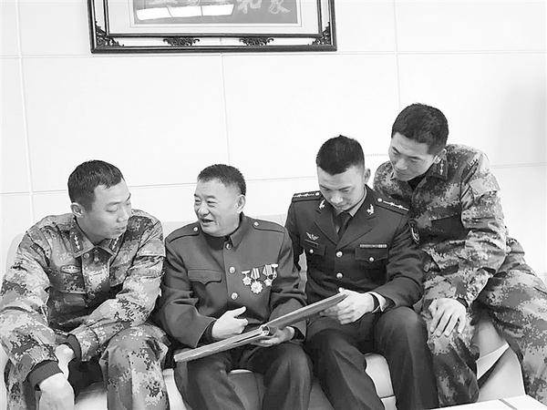 本报讯 (记者 陈永团 文/图) 追忆峥嵘岁月,铁血军魂永在。2月3日上午,春节的脚步越来越近,空气中弥漫着节日的喜庆气息。3名返乡探亲的“周口好兵”,一等功臣柳东坡、刘威、崔二伟相约慕名来到被中央军委授予“英雄步谈机员”荣誉称号、一等功臣海水干家中,聆听老英雄讲述当年的战斗事迹,上了一堂生动的国防教育课(如图)。