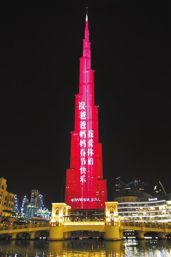 ⑤ 2月4日,在阿联酋迪拜,世界第一高楼哈利法塔上演春节灯光秀,迎接中国农历新年。