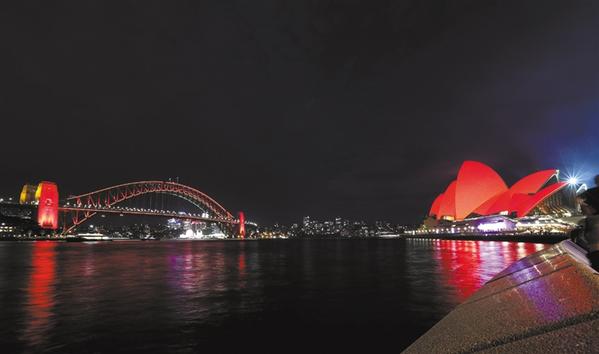 ⑨ 2月4日晚,澳大利亚悉尼的悉尼歌剧院和海港大桥同时披上“中国红”。