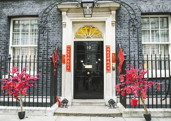 ③ 1月31日,在英国伦敦,唐宁街10号首相府门前贴着春联、福字等春节装饰,庆祝中国农历新年。