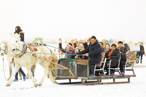 游客在南疆巴音郭楞蒙古自治州境内的博斯腾湖冰面上体验马拉爬犁(2月6日摄)。