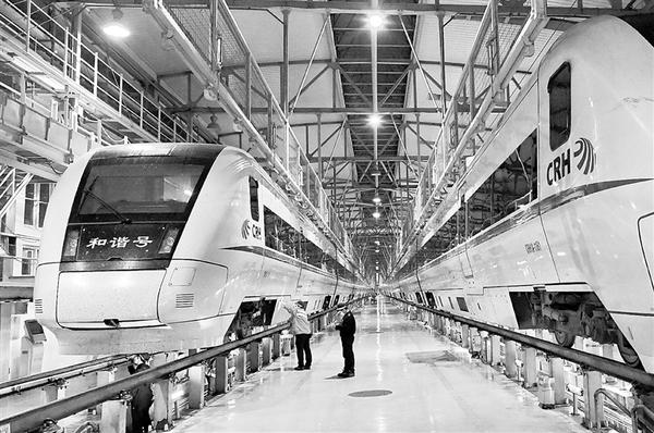 2月14日晚,工作人员在福州南动车所检修动车。春运以来,福建省近3000名高铁动车维护人员日夜坚守岗位,通宵达旦对181组高铁动车进行全面检查维护,确保每辆高铁动车安全上线,平稳运行。新华社记者 张国俊 摄