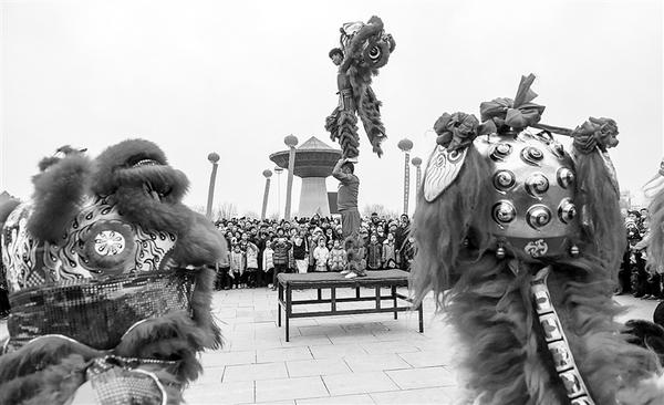 ① 2月18日,河北省阜城县花会展演上的舞狮表演。