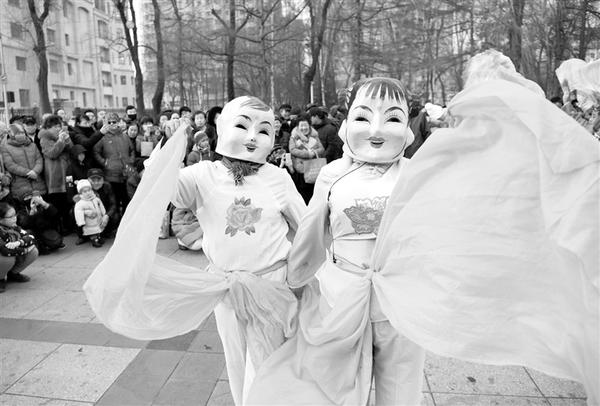 ③ 2月19日,在黑龙江省牡丹江市元宵节秧歌展演现场,民间艺人在进行民俗表演。