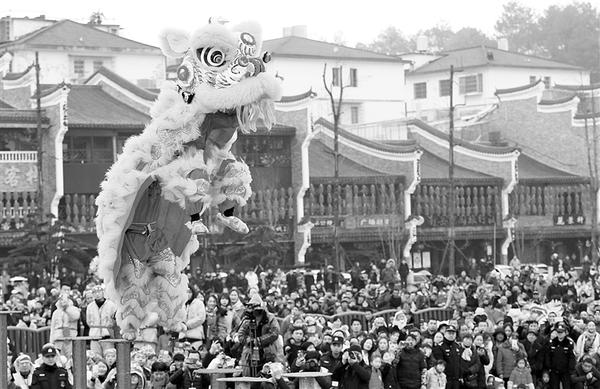 ① 2月19日,在湖南省衡阳市南岳区万寿广场,民间艺人在表演舞狮。