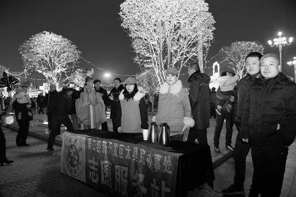 2月19日晚,在开发区人民广场,志愿者为前来赏灯的市民提供了热水,并引导市民文明赏灯,提醒带孩子的市民看好自己的孩子。