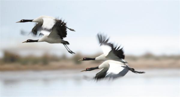 2月21日在草海国家级自然保护区内拍摄的黑颈鹤。当日,贵州省威宁彝族回族苗族自治县草海国家级自然保护区内,黑颈鹤翩跹起舞、姿态万千。新华社发