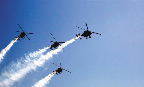 这是2月20日在印度班加罗尔拍摄的航空展上的飞行表演。第12届印度航空展20日在印度南部城市班加罗尔耶拉汉卡空军基地拉开帷幕,来自20多个国家和地区的400多家参展商参展。新华社记者 姜磊 摄