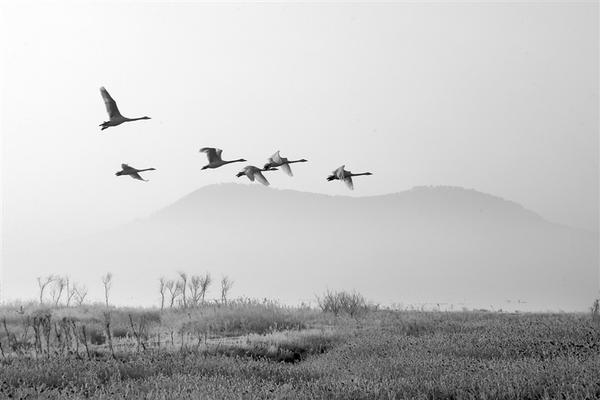 近日,随着天气转暖,在山东荣成越冬的大天鹅陆续开始向北回迁。 新华社发