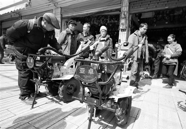 2月24日,在贵州省丹寨县县城,农民在选购微型耕种机。眼下正值春耕备播时节,各地农民挑选合适农资,为春耕生产做准备。黄晓海 摄