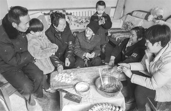 2月24日,深州市大冯营乡家庭和睦“最美家庭”李大冒(左一)一家人在包饺子。近年来,河北省深州市深化精神文明创建,在全市镇、村举办推选“最美家庭”和“最美村民”等活动,挖掘群众身边的“微小感动”,传播“凡人善举”,推动社会主义核心价值观融入社会生活。 李晓果 摄