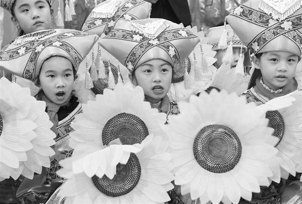 2月25日,孩子们在南宁市玉兰路小学开学典礼上表演情景剧。当日,广西南宁市中小学正式开学上课。新华社记者 周华 摄