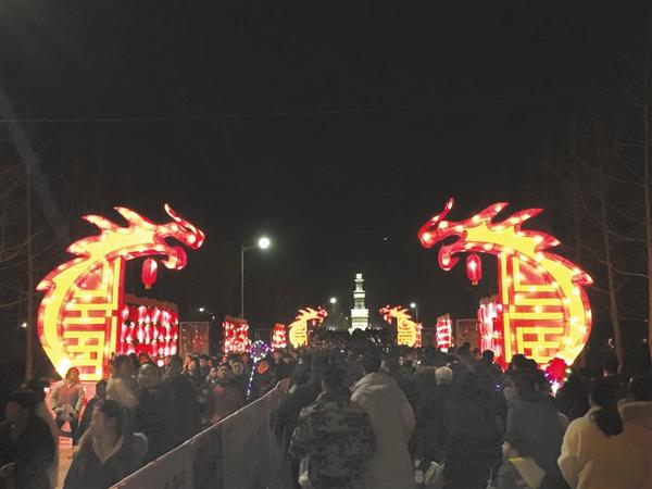 2月19日,元宵节。夜幕降临,东新区灯光璀璨,美轮美奂,到周口公园赏灯的市民络绎不绝。 记者 张劲松 摄