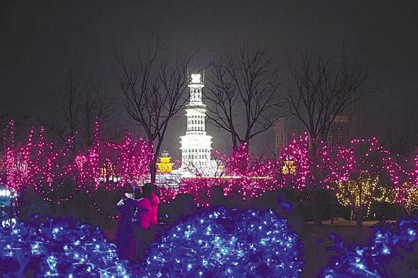 2月19日晚,周口公园里的LED灯带、灯网和霓虹灯交相辉映,远观如点点繁星,引得市民驻足拍照留念。