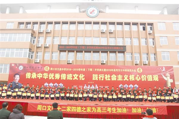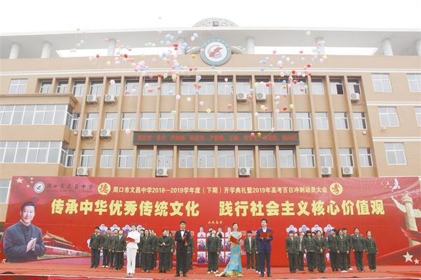 “2019年,高考必胜!2019年,高考必赢!2019年,我们必将创造高考奇迹!加油!加油!加油!”在周口市文昌中学2019年春季开学典礼暨高考百日誓师大会的现场,学子们紧握拳头,举起右手,立下誓言,向教师和家长作出郑重承诺。铮铮誓言,喊出了师生蓬勃向上的激情和对2019年高考的美好憧憬。