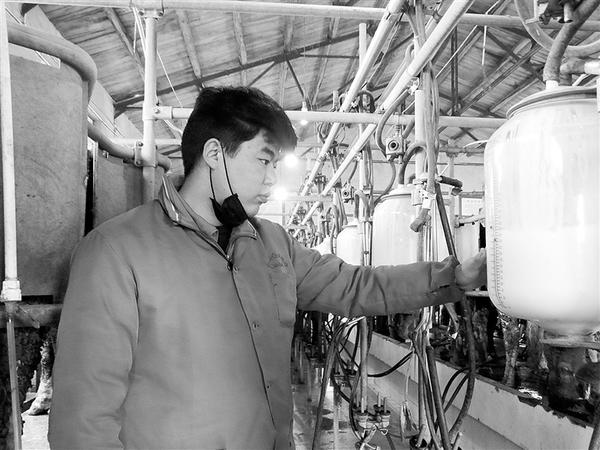 2月27日,在沈丘县付井镇“一起发”奶牛养殖合作社的挤奶站,工作人员正细心观察机械化挤奶过程。